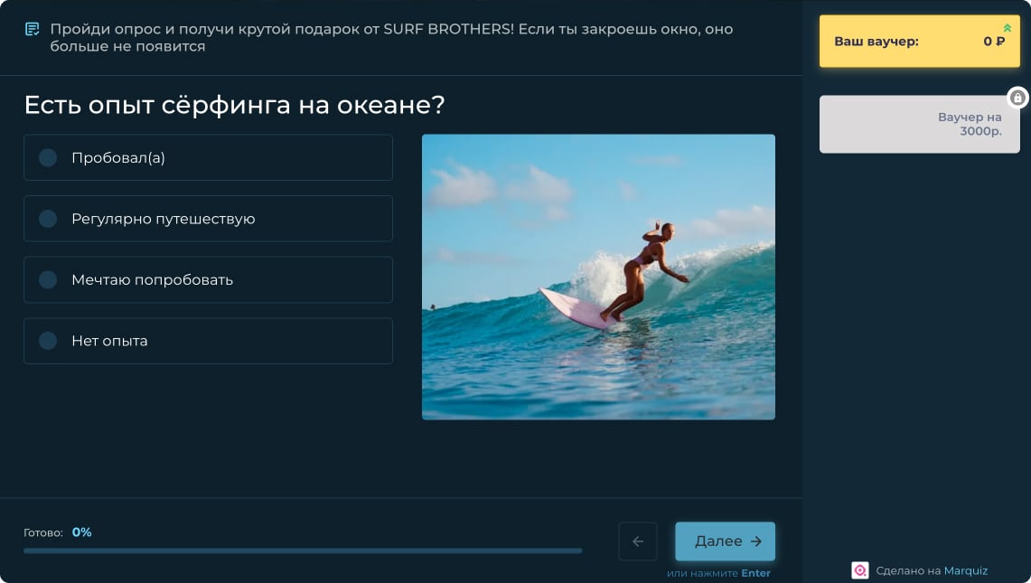 Посмотрим квиз компании, которая проводит тренировки по сёрфингу на искусственной волне. Мы писали о ней выше.