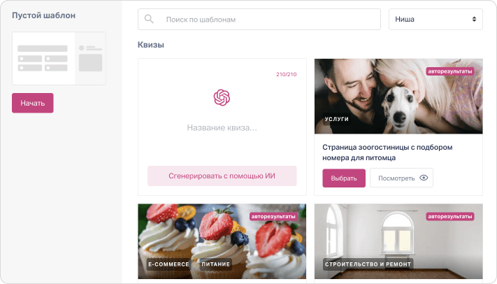 Интегрированный искусственный интеллект помогает побороть страх чистого листа и подсказывает интересные идеи. Пробуйте создавать квизы за одну минуту.