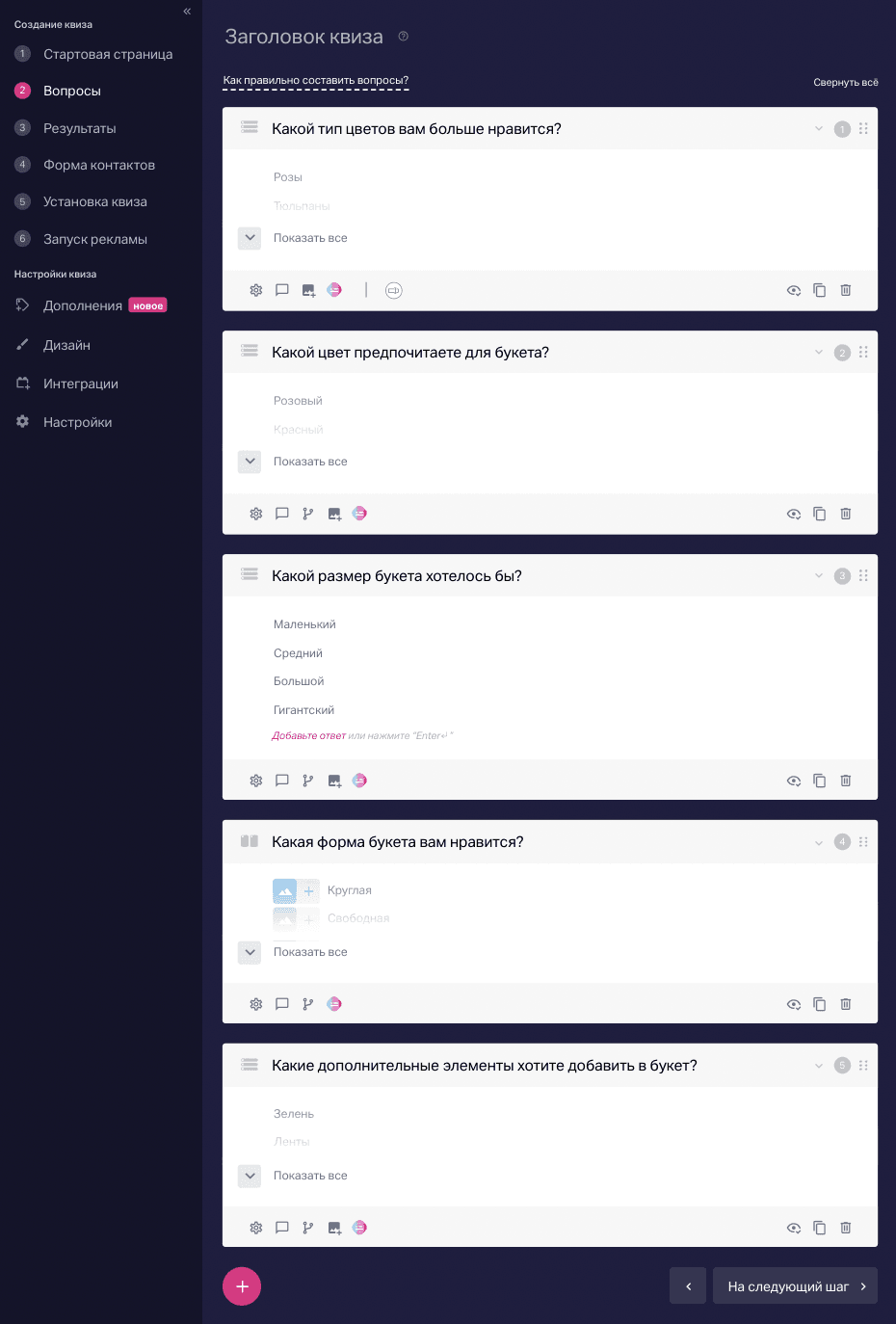 Дальше уже в квиз можно наворачивать разные конверсионные фичи: скидки, бонусы, подсказки консультанта, динамический контент. Для нашего квиза по подбору букета хорошо бы добавить ветвление и показать несколько результатов перед формой контактов.