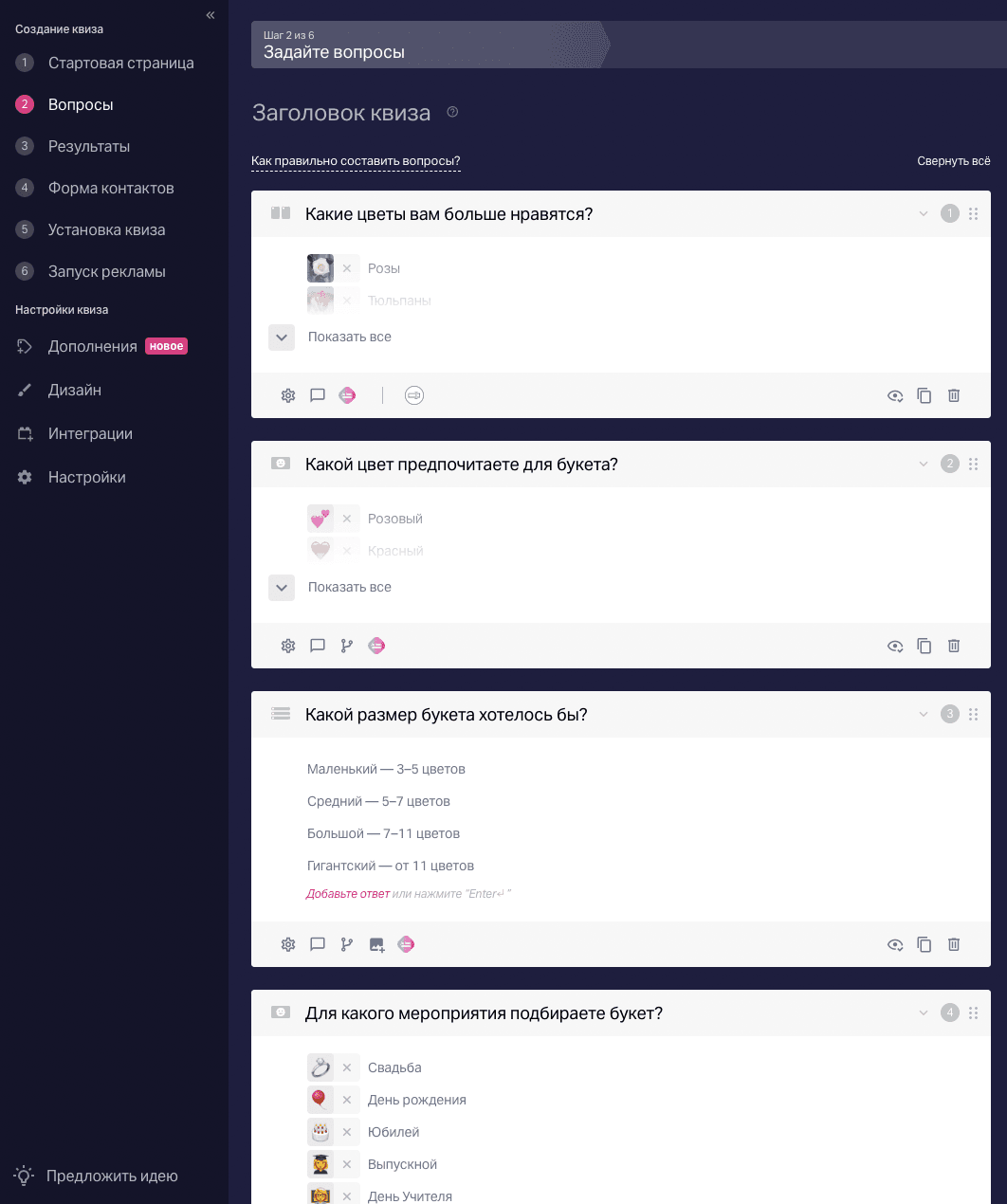 Мы взяли для примера «Подбор готового букета для праздника» и через минуту получили вопросы и ответы для нашего квиза: