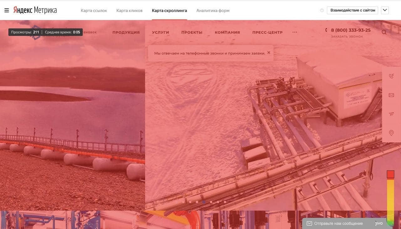*Это тепловая карта. Самые посещаемые части сайта выделены красным, например, первый экран. Люди заходят на него чаще всего, поэтому всю важную информацию стоит расположить ближе к шапке. А дальше они почти не доходят — на цветовой шкале это выделено желтым и зеленым цветом