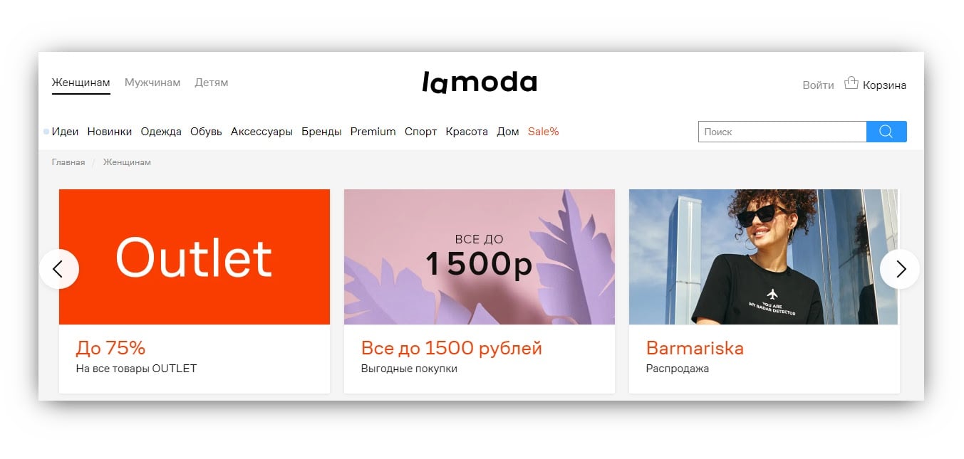 *На Ламоде столько одежды, обуви и косметики, что можно потеряться там на целый день. Поэтому на главной странице есть подборки со скидками и актуальными товарами, чтобы покупатели не тратили время зря