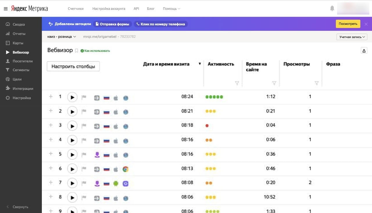 *В Вебвизоре видно, кто заходил на сайт, с какого устройства и сколько времени там провел. Сессии по несколько секунд плохо влияют на статистику сайта, поэтому нужно вручную проверять, на каком месте пользователь ушел со страницы