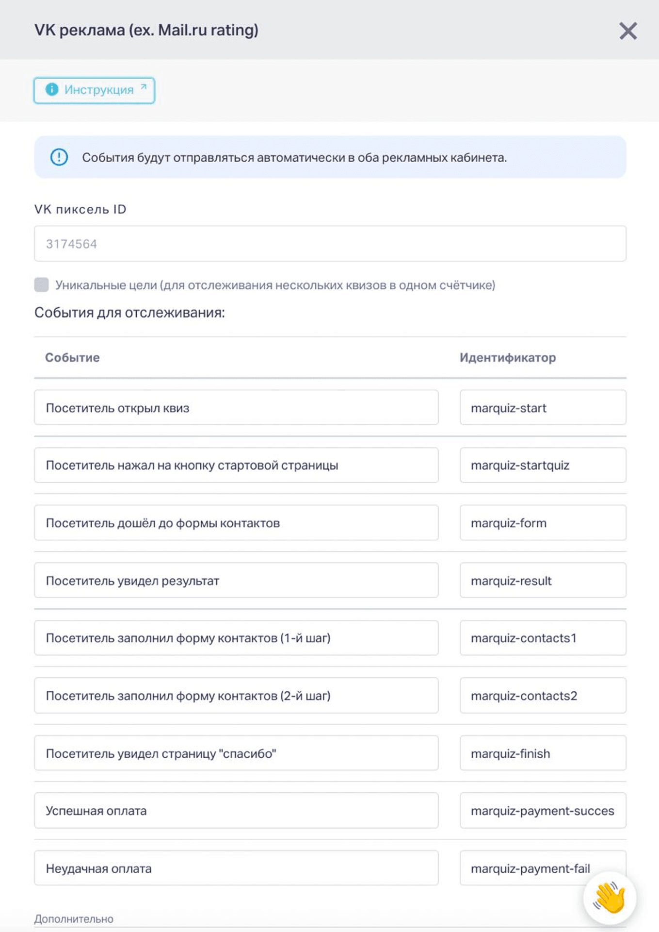 Список событий по ВК Пикселю из панели Марквиз, раздел «Интеграции»