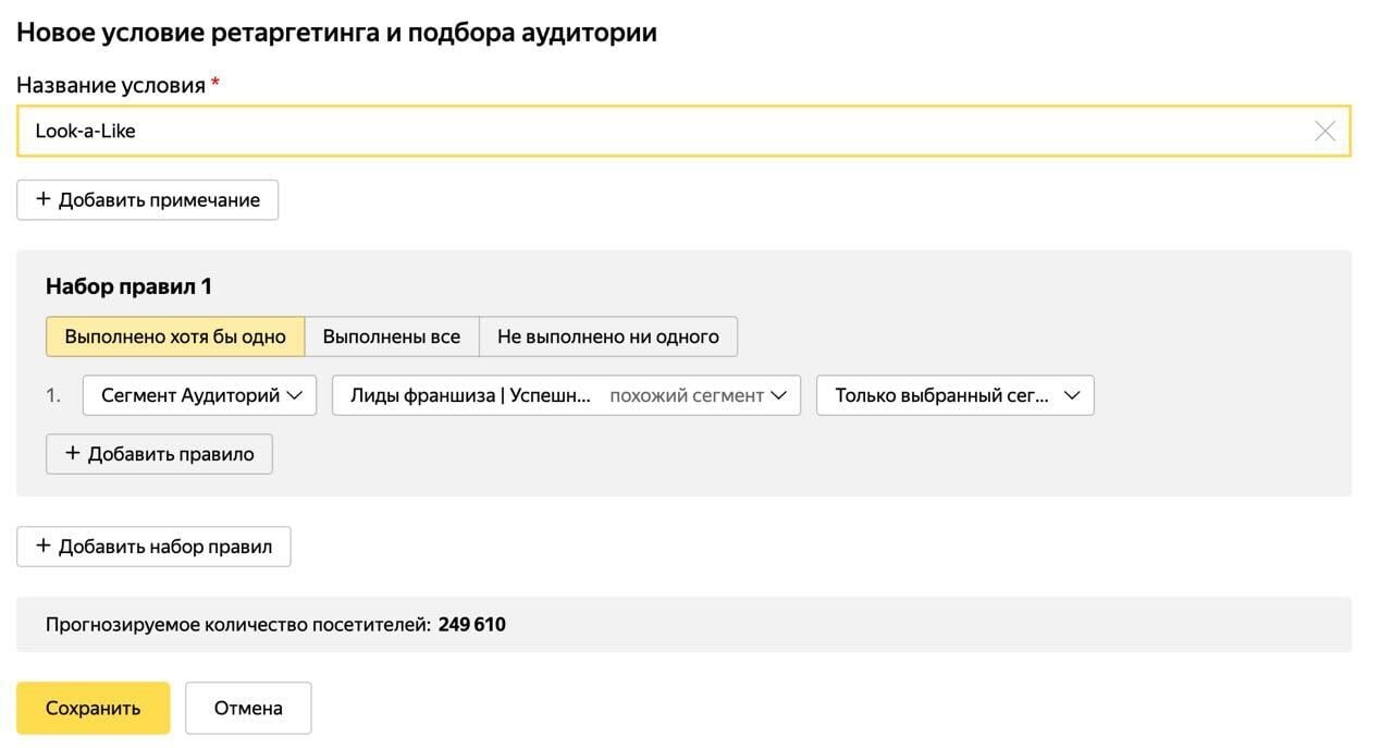 Похожие сегменты в Яндекс Директе создаются следующим образом: