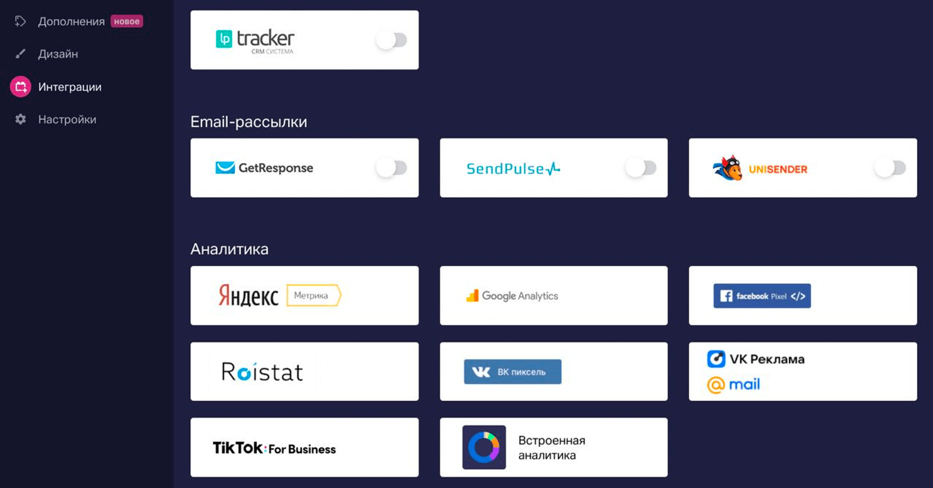 Разложить по полочкам всю информацию от пользователей помогают квизы. Можно делить клиентов в зависимости от ответов и поведения пользователей. Рекомендуем пользоваться интеграциями Марквиз. Для этого в панели выбираем веб-инструменты, с помощью которых можно отслеживать поведение пользователей на сайте, анализировать их целевые действия и создавать аудитории, наиболее точно отвечающие задачам бизнеса: Яндекс Метрика, Google Analytics, FB** и ВК Пиксель.