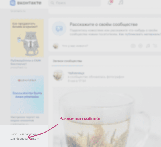 — через сообщество в ВК. Выбираем вкладку «Для бизнеса»