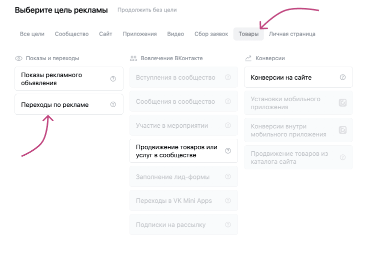 Попадаем в раздел «Выбрать цель рекламной кампании». Переключаемся во вкладку «Товары» и ВК автоматически подсвечивает нужные цели. У нас узконаправленный товар, поэтому нам подходит «Переходы по рекламе».