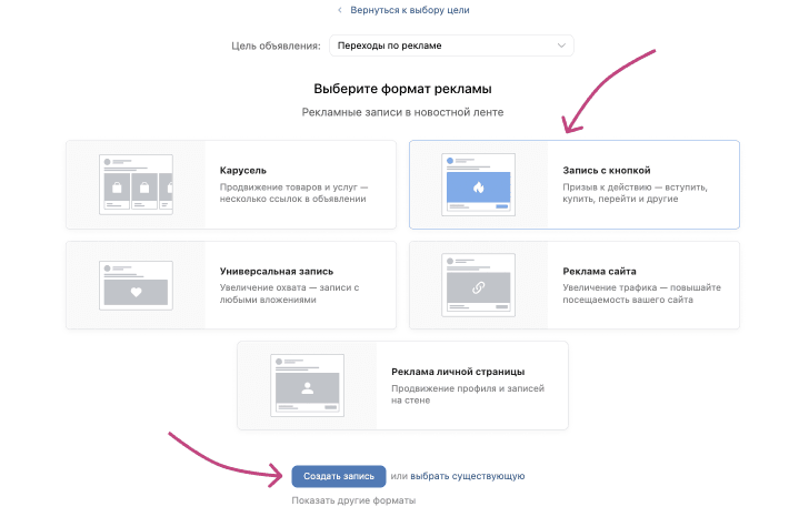 ВКонтакте предлагает несколько форматов рекламы, для нашей первой будем использовать «Запись с кнопкой». Это короткий формат объявления с очевидным призывом совершить действие и нажать на кнопку.