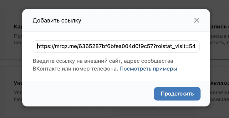 Указываем ссылку на сам квиз или на квиз-приложение в ВК: