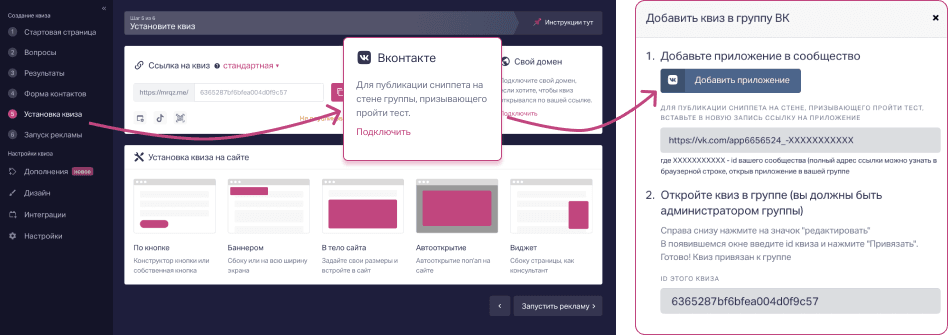 Если хочется подключить квиз как приложение, то заходим в личный кабинет Марквиз в раздел «установка» и добавляем в два клика квиз в ВК-группу.