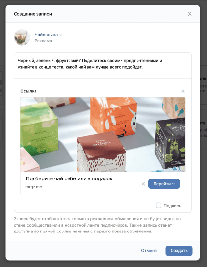 Чтобы было наглядно видно, как за шесть шагов от двери до двери настроить рекламу на квиз в ВК, возьмём манекен — придуманную компанию по продаже чая в Минске.