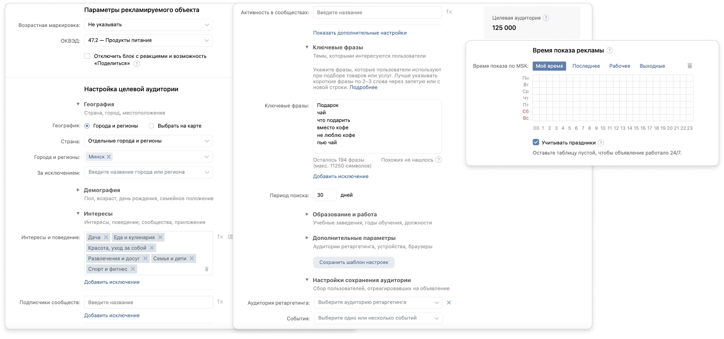 — добавляем похожие сообщества. Здесь изучаем не только сообщества конкурентов, но и смежные, которым наш продукт возможно будет интересен. Например, рекламируем чай в кулинарном сообществе или мамских чатах — это ок;