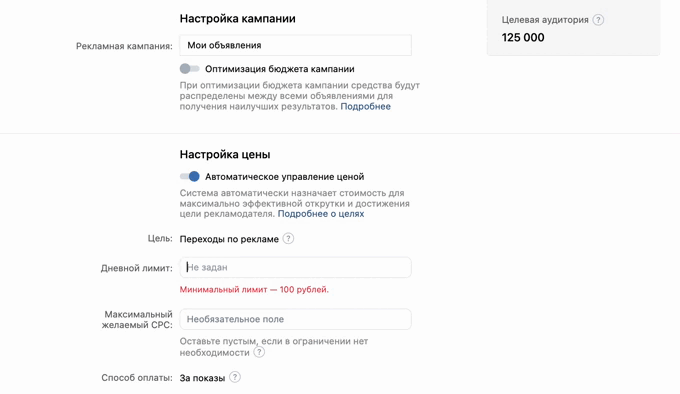 По плану у нас бюджет 10 000 рублей, поэтому ограничиваем бюджет до 330 рублей в день.