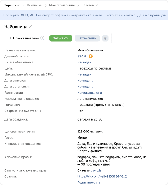 Всё, готово. Осталось пополнить счёт. Нажимаем кнопку «Запустить» и ждём одобрения модератора.