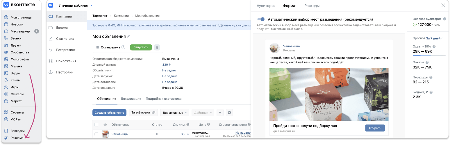 Заходим рекламный кабинет ВК: