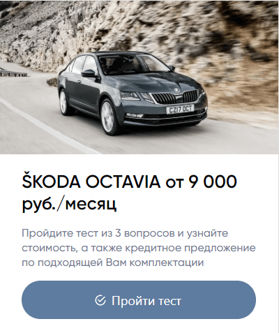 Квиз составили по автомобилю ŠKODA Octavia. Так как рекламные кампании мы решили сосредоточить уже только на кредитное предложение, на главной странице мы продублировали ежемесячный платеж, а не использовали общие выгоды или фразы “специальное предложение…. “. Т а ким образом мы еще раз подтверждаем предложение, которое клиент увидел в рекламе, и больше заинтересовываем его оставить заявку для получения подробностей.