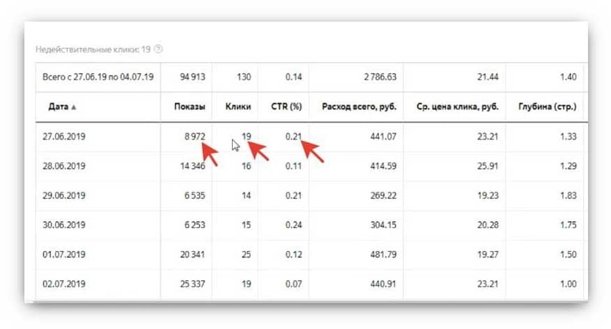 Самый важный показатель эффективности рекламной кампании — это CTR (click-through rate). Он показывает, сколько людей кликнуло по объявлению после показа. В примере CTR низкий — хорошим показателем считается показатель CTR 10%.