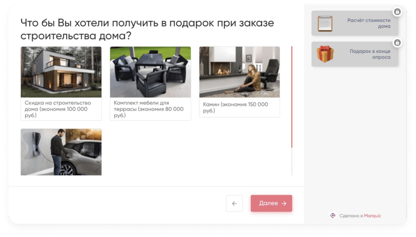 Бонусы, скидки и подарки. Уже с первого экрана пользователь видит, что он получит, когда пройдет квиз. Подарком может быть чек-лист, прайс, расчет стоимости, мини-курс. Главное, чтобы это не была банальная «бесплатная консультация», а действительно что-то полезное для пользователя — тогда фишка сработает.
