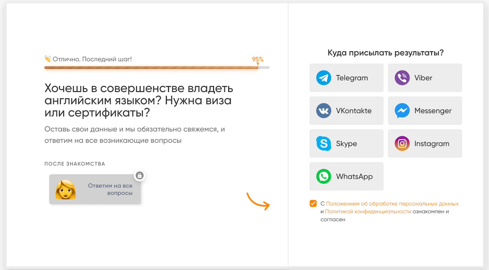 ✅ 5 вопросов с картинками. На последнем вопросе спрашивают про готовность купить. Вне зависимости от ответа пользователь направляется на страницу школы