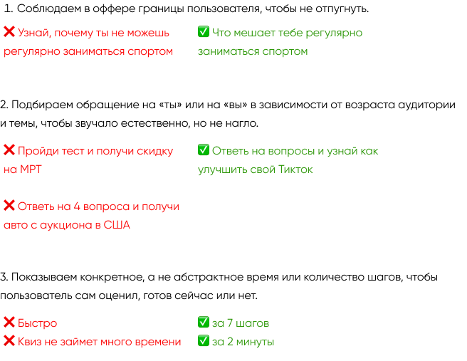 ✔️ Найти боль клиента. Фраза «Этот квиз поможет клиенту…» и добавить решение проблемы.