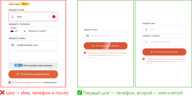 - Двухшаговая форма контактов — чем меньше полей, тем легче пользователю заполнить форму. На первом шаге лучше спросить что-то одно, например, телефон. Даже если на втором шаге пользователь не захочет дальше делиться контактными данными, телефон уже будет в копилке.