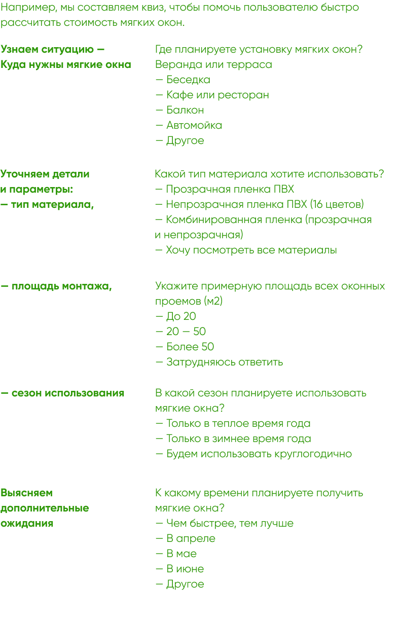 ✔️ Составить вопросы, чтобы помочь пользователю выбрать то, что ему нужно: