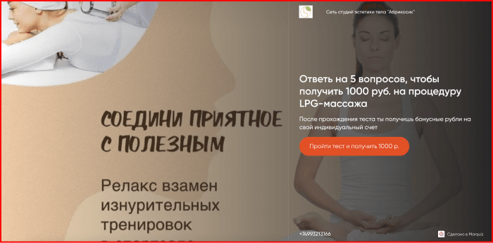❌ LPG-массаж спрятан в углу, внимание пользователя направляется на расплывчатое «Соедини приятное с полезным», девушка скрыта за оффером