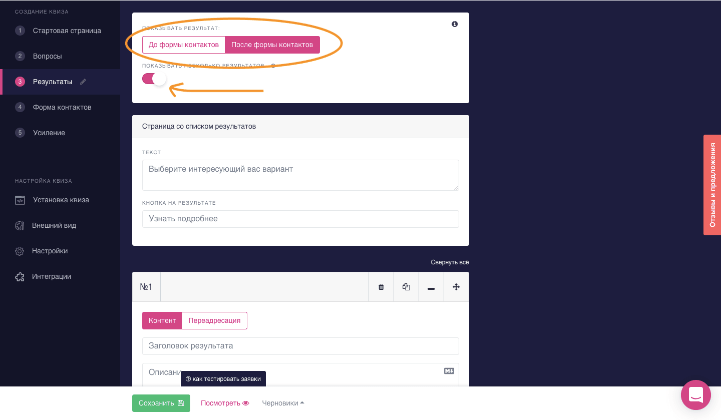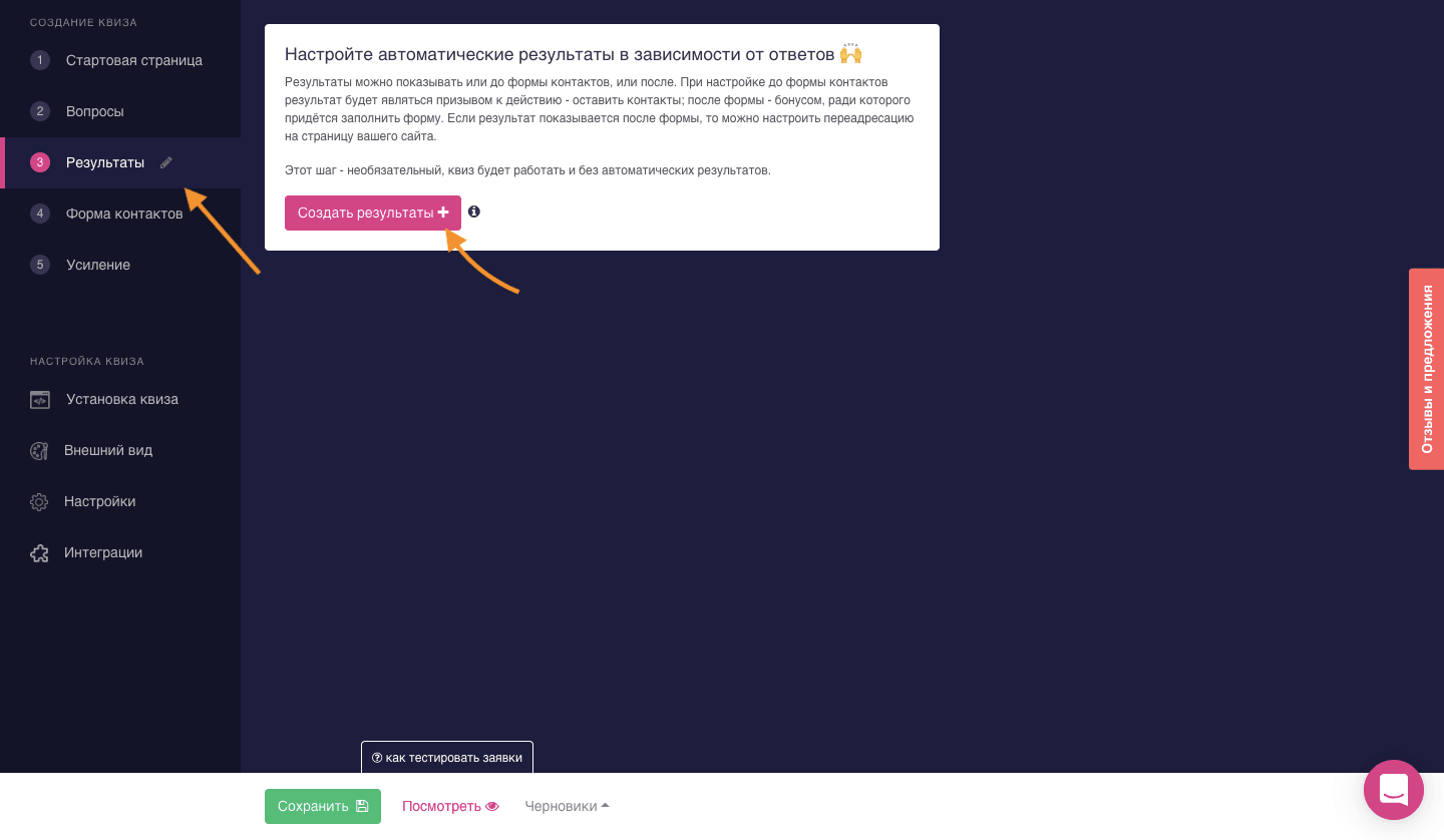 P.S. Не забудьте сохранить квиз и проверьте корректность отображения результатов в зависимости от ответов, в этом вам поможет кнопка “Посмотреть” внизу страницы.