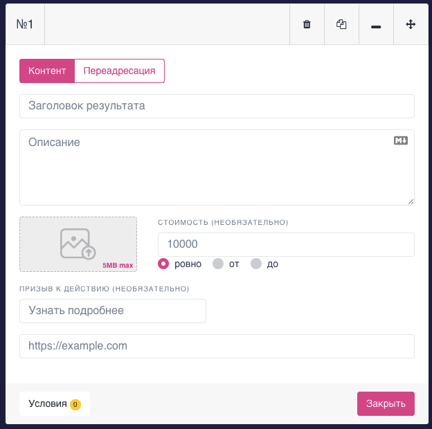 Идея функции авторезультатов в марквиз полностью построена на том, чтобы показать результат в зависимости от ответов потенциального клиентов в квизе. Поэтому настройка условий, пожалуй, самый ответственный шаг.