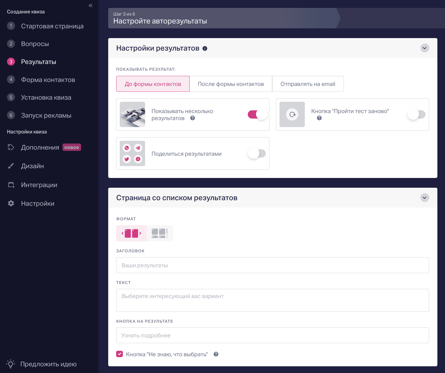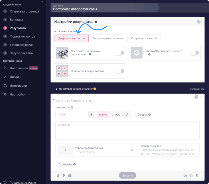 В панели в разделе «Результаты» включаем тумблер «До формы контактов». Откроется пустая карточка первого результата.