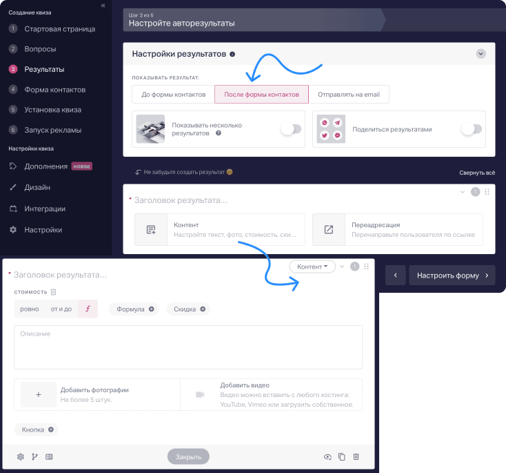 Шаг 2. Заполняем карточку результата. Здесь можно добавить текст, индивидуальную скидку, фото или видео, кнопку с призывом к дальнейшему действию. Если результат показываем до формы контактов, то кнопка будет вести на саму форму, если после — кнопкой можно переадресовать на сайт или вообще её не ставить.