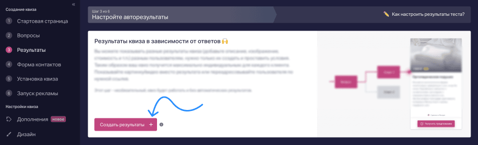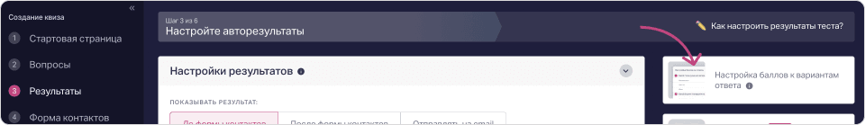 Шаг 1. Переходим в раздел «Результаты» и нажимаем «Создать результаты». Выбираем, когда будем их показывать — до формы контактов или после.