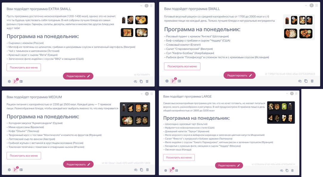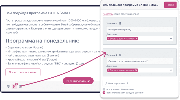 Вот, например, рацион Extra Small может показываться при определённых ответах в двух разных вопросах: