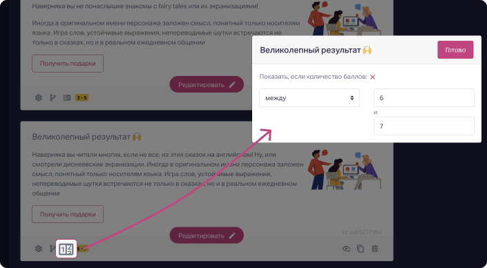 Добавим два полезных пункта: один, чтобы прокачать индивидуальную настройку квиза, и второй, чтобы показать результаты группой, если посетителю подойдёт по ответам сразу несколько вариантов.