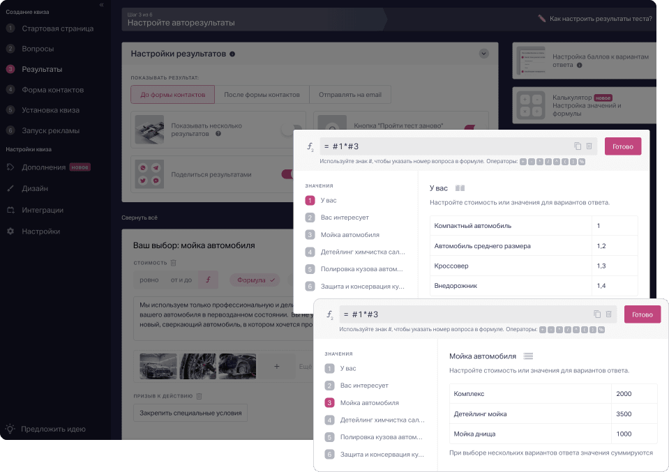Например, даём расчёт по услугам детейлинг-центра. Первый результат зависит от ответа на вопрос «Какой у вас автомобиль» — выставляем коэффициент — и ответа на вопрос про допуслуги «Химчистку салона» — прописываем стоимость.