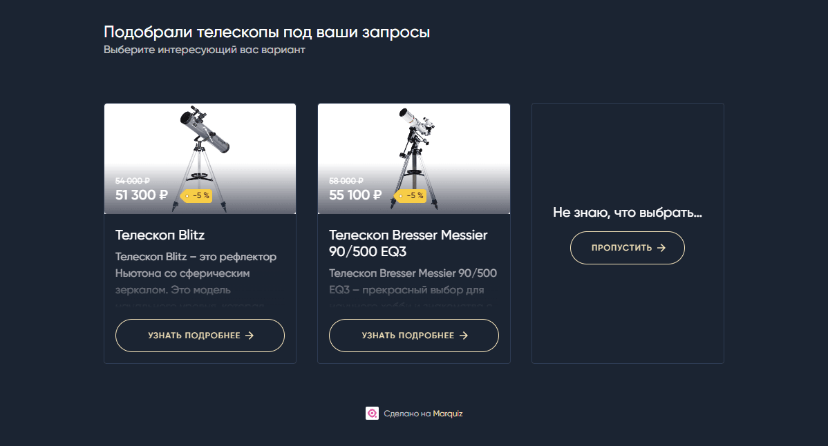 Если настроить несколько результатов, это поможет точнее попасть в запрос пользователя и показать именно то, что нужно. Пользователь спокойно оставит контакт, если увидит для себя пользу, что он не зря проходил квиз. ❤️