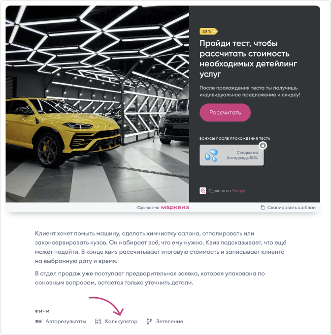 Посмотреть вживую, как собрать такой квиз — в шаблоне расчёта стоимости детейлинг-услуг