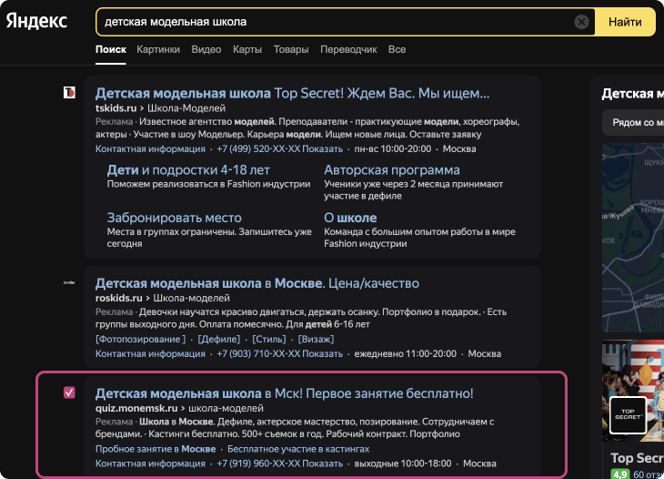 Например, пользователь ищет модельную школу для своего ребёнка. Есть конкретный запрос и на него в выдаче показывается текстовый рекламный блок. Он может выглядеть так: