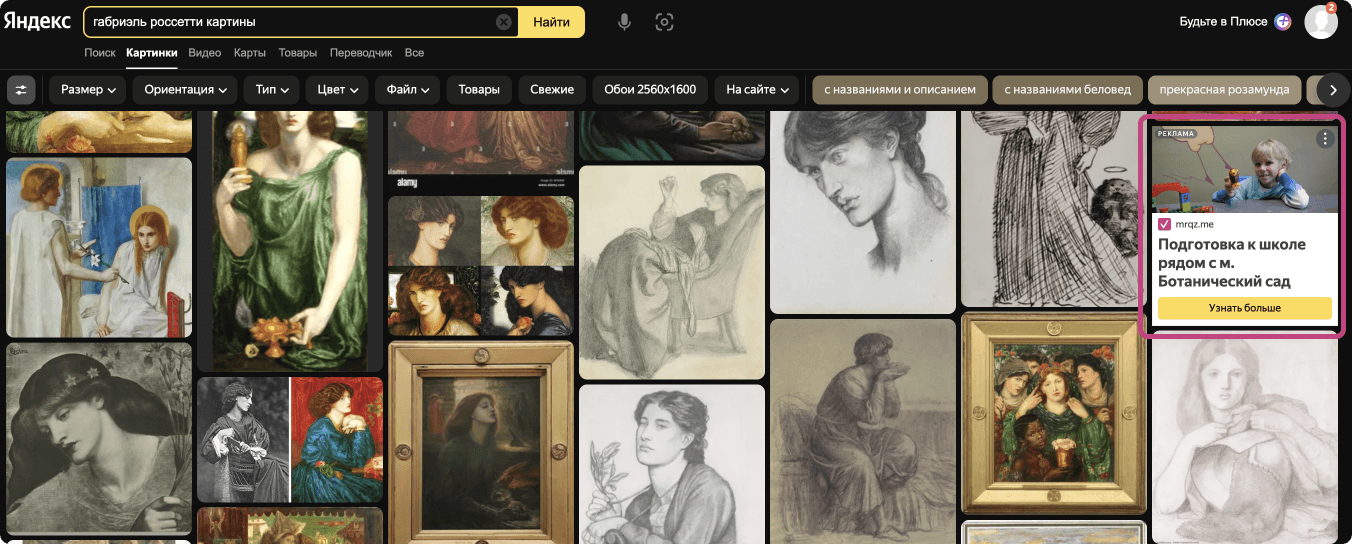 Другой пример контекстной рекламы: пользователь недавно засветился поиском детской модельной школы, и его догоняет реклама другой компании не в выдаче, а на площадке Яндекса. Алгоритм выдаёт показы объявлений по смежному ключевому запросу пользователя. Скорее всего, это слово «школа».