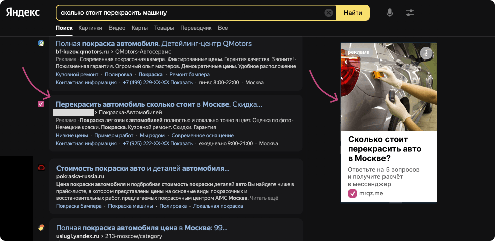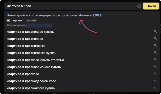 Примерно такой же уровень цен у поисковых кампаний, которые напрямую отвечают запросу. Сервис показывает объявление, когда пользователь ещё только начал вводить свой запрос, и заголовок перехватывает клиента практически на первой ноте, то есть на верхней строке: