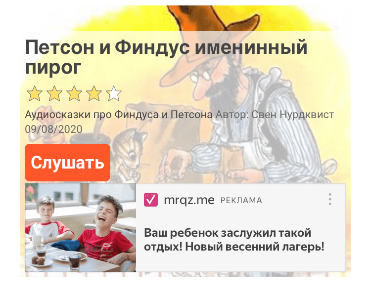 Например, тематическая контекстная реклама на сервисе аудиосказок для детей, одной из площадок РСЯ схожей тематики. Пользователь видит объявление, которое может ему подойти по интересам и социо-демографическим характеристикам. Он кликает и переходит на квиз: