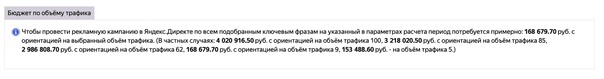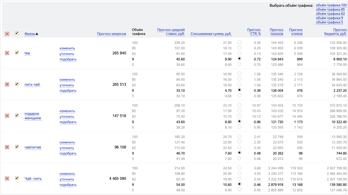 1. Контекстные запросы. Например, Яндекс Директ сам посчитает прогноз по основным метрикам по каждому слову и можно предварительно оценить, какой бюджет понадобится. Вот пример, какая будет ставка по контекстным словам. Предположим, что у нас в продвижении интернет-магазин чая: