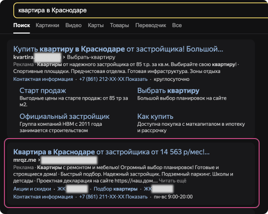 🔨 Написали несколько рекламных объявлений, чтобы протестировать и найти оптимальный вариант. В объявлениях не забываем указывать быстрые ссылки, дополнения, уточнения, контактную информацию компании.