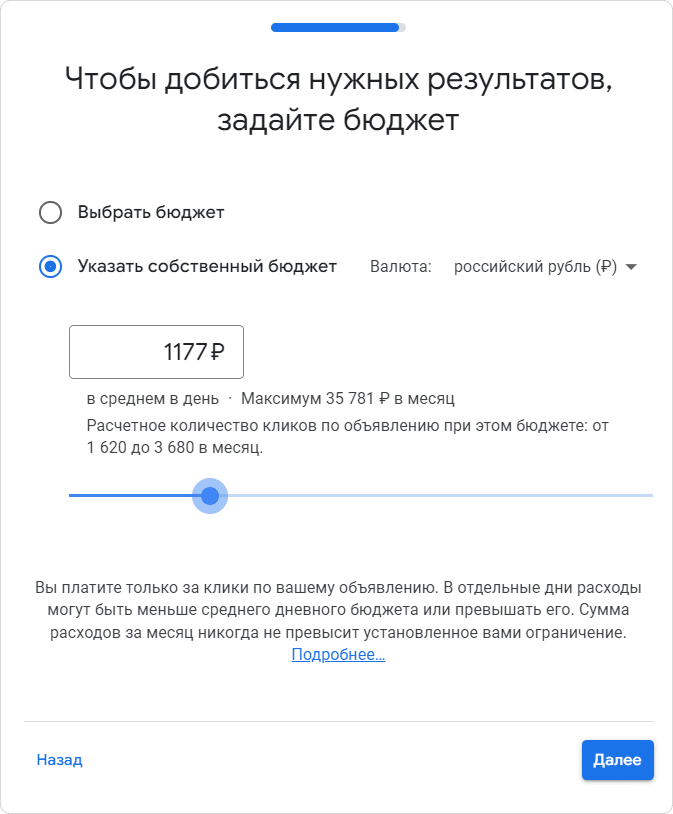 ❌ минимальным бюджетом (минимальная ставка за клик зависит от конкуренции в нише).