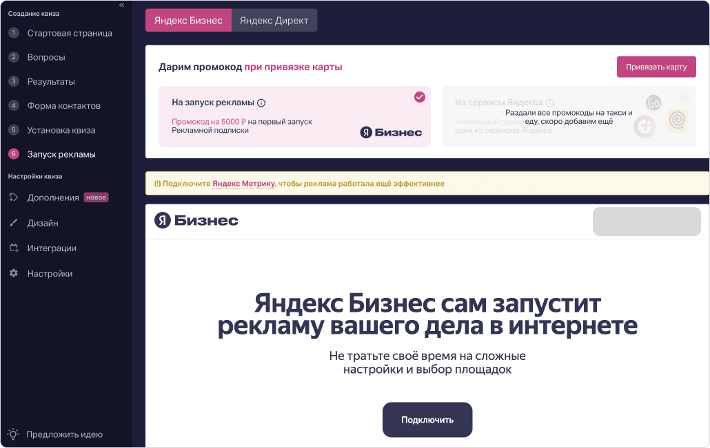 В панели Марквиз можно настроить интеграцию с Яндекс Директ или Яндекс Бизнес. Второй вариант подходит для начинающих — с ним всё запустится автоматически, нужно только заполнить анкету и оформить подписку.