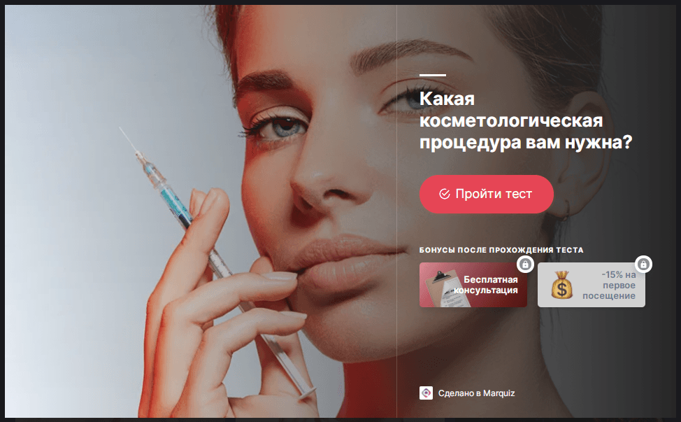Допустим, вы врач-косметолог. Вместо обычной формы «Оставить заявку» на сайте можно поставить тест, который поможет женщинам подобрать именно тот «укол красоты», который нужен им здесь и сейчас. А вы в этот момент соберете их контакты для рассылки, ретаргетинга и получите в итоге «прогретого» и лояльного пользователя. Вот как может выглядеть квиз.