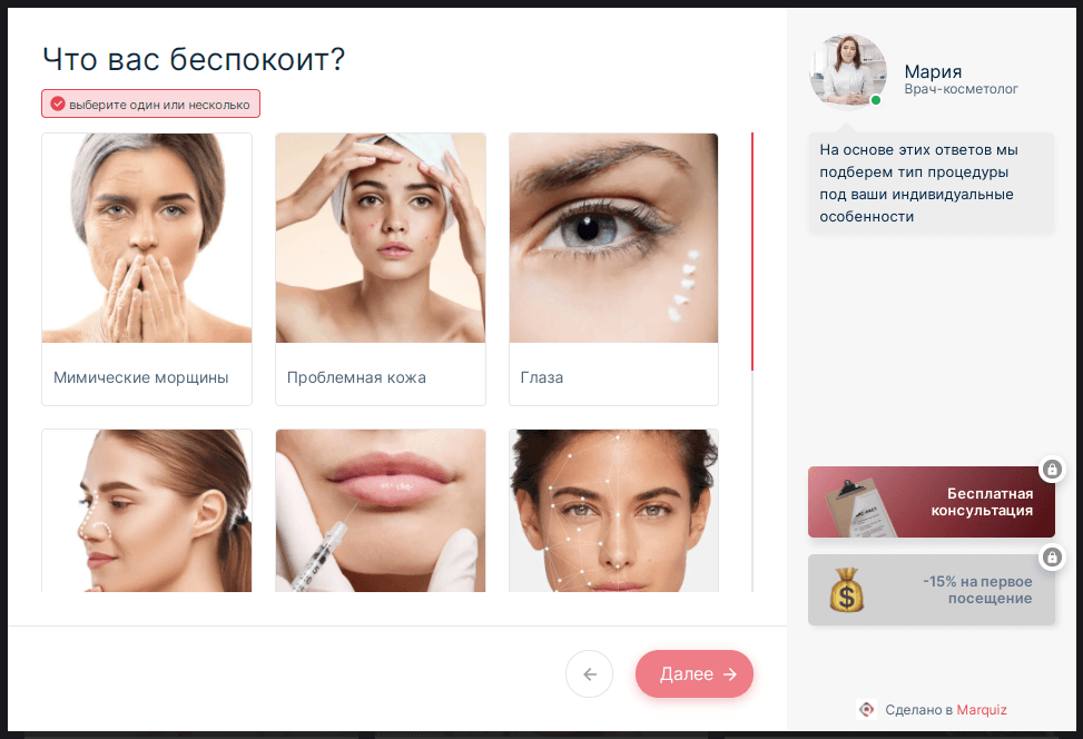👉** Легче предложить подходящий товар**. Иногда новый клиент заходит на сайт без четкого запроса. Когда мы идем к врачу-косметологу, то еще не знаем, какая процедура нам нужна. Но мы знаем, что хотим избавиться от морщин, акне или мешков под глазами. Правильно составленный квиз в этом случае сработает так же, как консультация по телефону, но при этом без участия менеджеров.