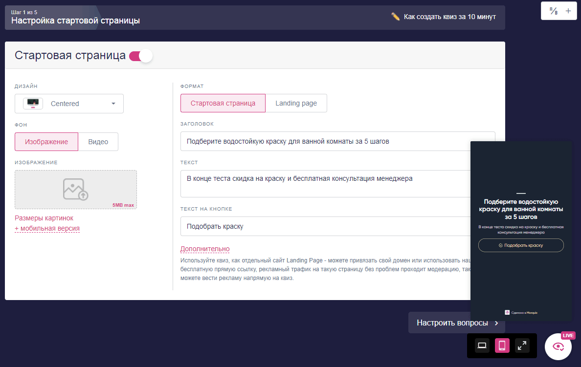 Вы можете посмотреть, как квиз будет выглядеть на смартфоне или компьютере, с помощью функции Live Edit. Так получится оценить дизайн и объем текста.