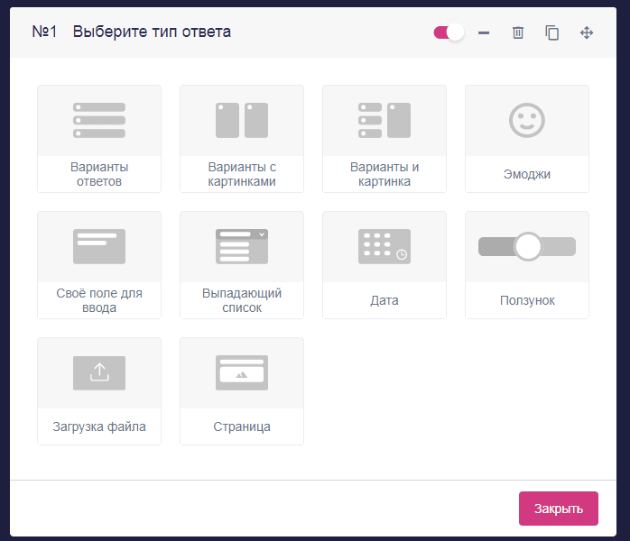 В квизе можно выбрать разные типы ответа в зависимости от ваших задач: выпадающий список, картинки с текстом, только текст, эмодзи и так далее. Все варианты можно посмотреть на скриншоте ниже.